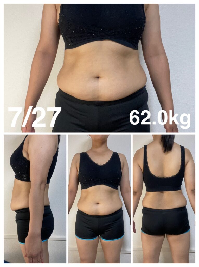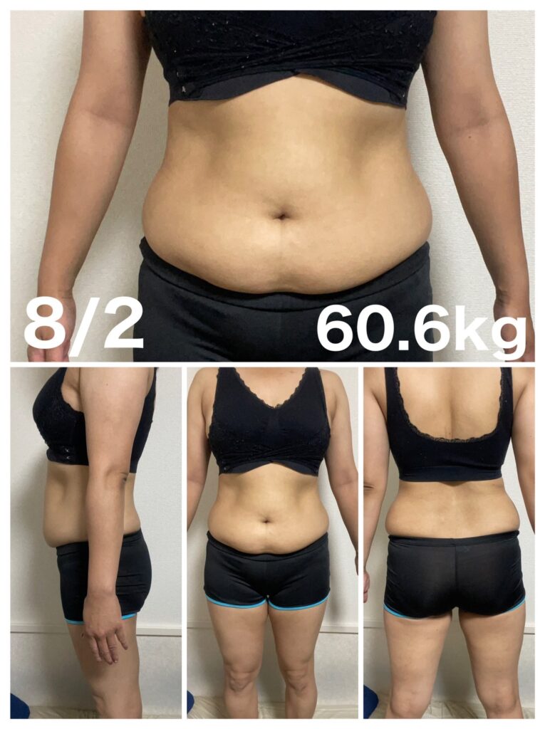 | 体重 | 64.3㎏→62.0㎏→60.6㎏ はじめてから‐3.7㎏ 先週から‐1.4㎏ |