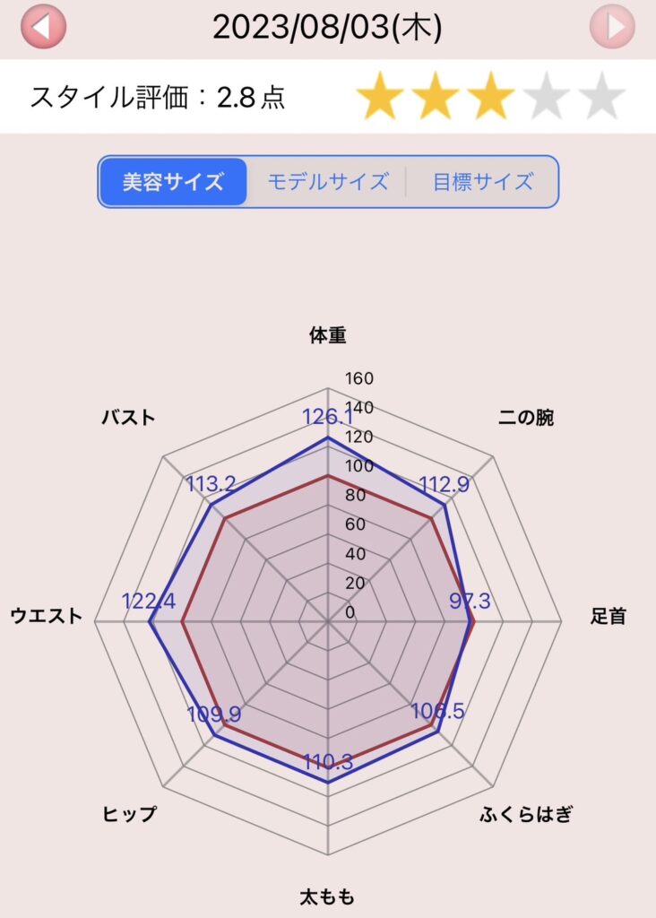 にしても、写真だと結構お腹減ってる感じするのにサイズだとウエストの変化そこまでないのよね……いや、2cmは大きな変化と思わないといけないのかな。